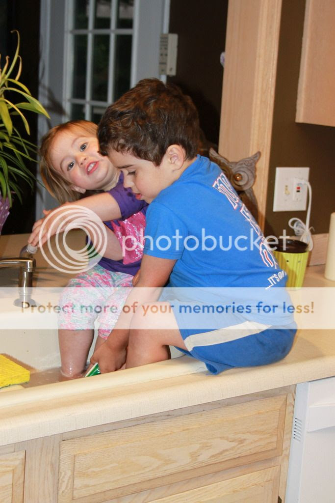 Myles and Camellia are just loving the fact that we are doing this in the kitchen sink.